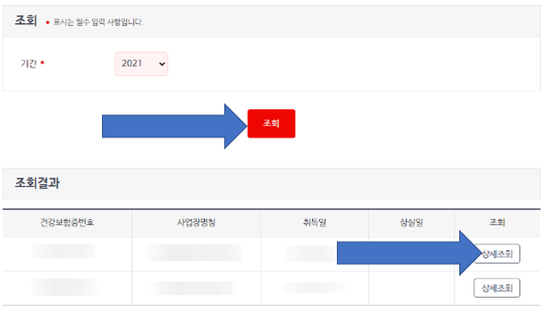 4. 조회 할 기간 선택 후 '조회' 버튼을 클릭하면 본인이 속한 사업장별 내역이 조회됩니다. 그리고 '상세조회'를 누릅니다