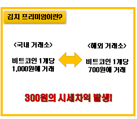 한국에서 거래되는 암호화폐의 시세가 해외 거래소 시세와 비교해 얼마나 높은가를 뜻하는 단어. 해외 거래소보다 높을 경우 '김치 프리미엄이 끼어 있다.' 비슷한 정도로 낮아질 경우 '김치 프리미엄이 빠졌다.'라고 표현한다.